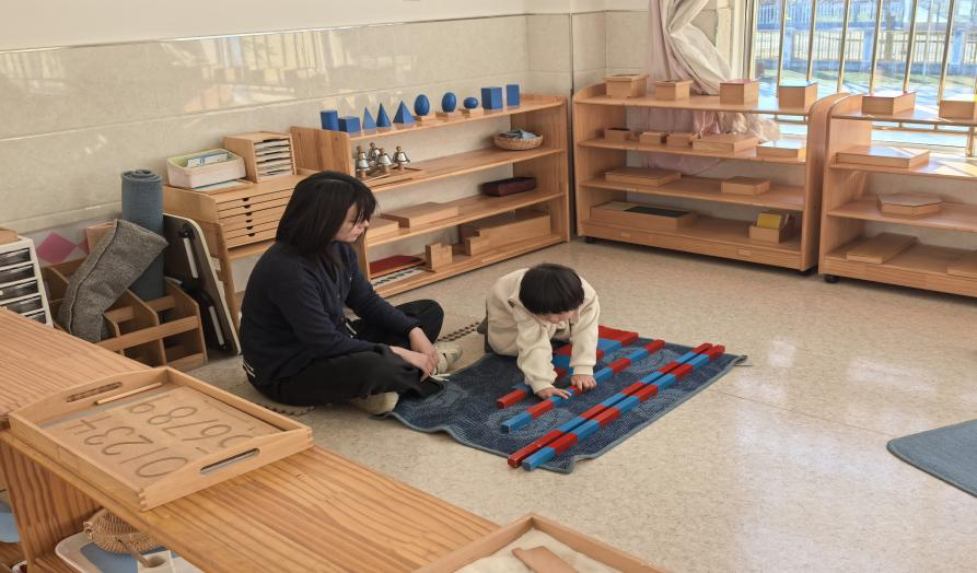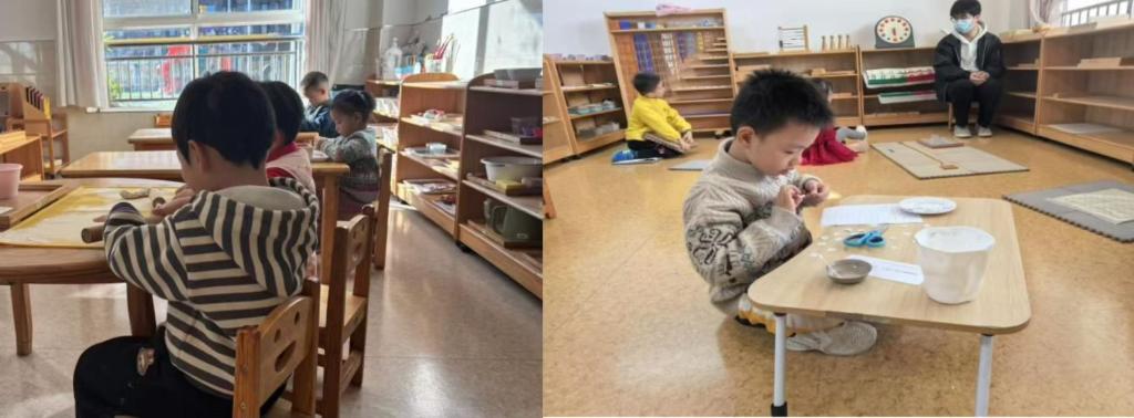 保教主任刘明珠将学生进行分组,进入不同班级进行观摩,在蒙台梭利教室环境创设方面,同学们重点观摩了日常生活区、感官区、数学区、语言区及文化科学区五大功能区域。大家认真观察教具的分类摆放、使用逻辑与儿童操作流程,详细记录环境布置背后所体现的“以儿童为中心”“有准备的环境”等核心教育理念。