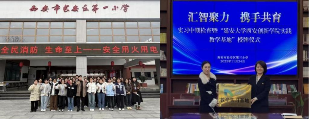 为扎实推进2026届毕业实习工作,精准掌握学前教育、小学教育专业实习生的实践动态,11月11日至11月24日,教育学院院长茹宗志、执行院长唐蜀湘、院长助理安增利,科研秘书马健刚、实践秘书李苗,先后前往西安市雁塔区第八幼儿园、曲江第十五小学、郭杜街道中心学校、西安国际港务区新农小学、长安区第一小学、长安区第三小学、雁塔区科创路小学实习基地开展中期检查与指导工作。
